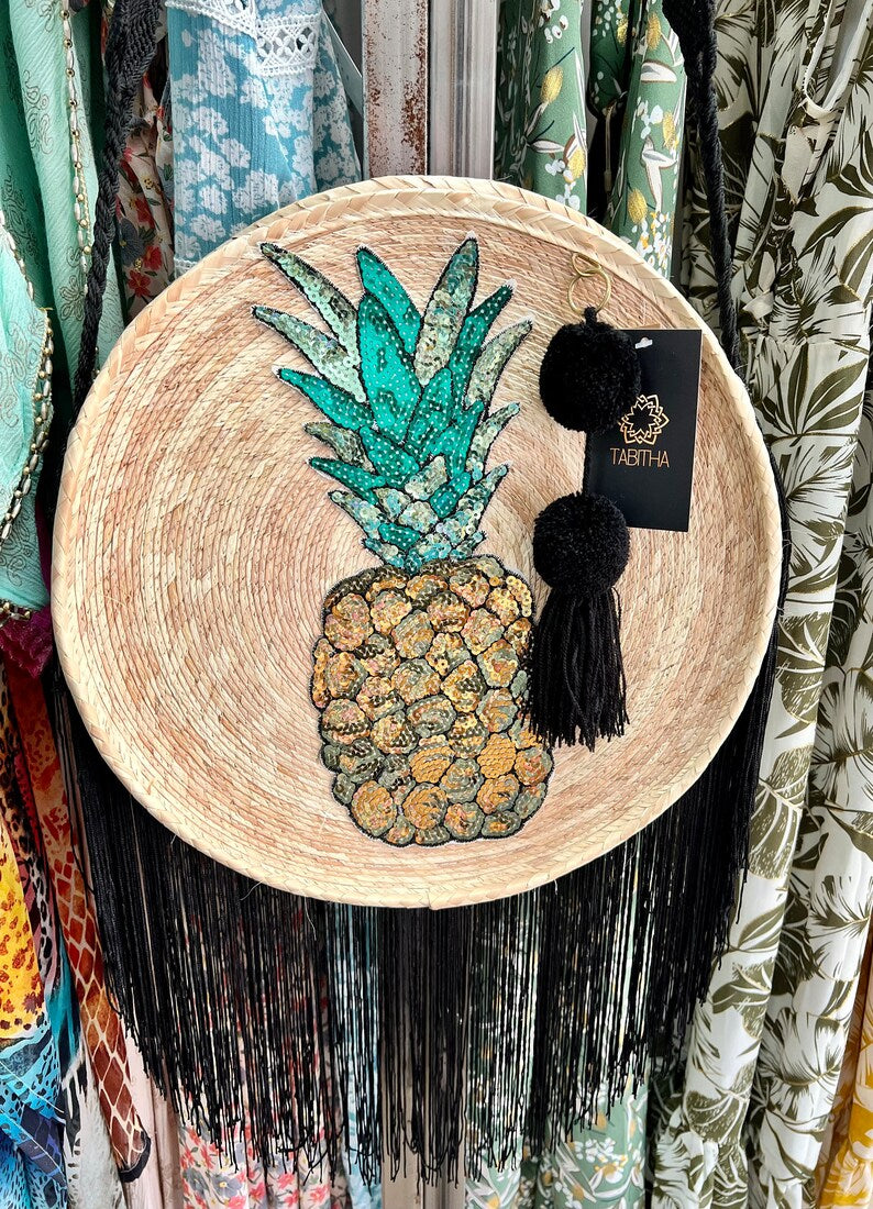 Capazo de estilo boho, realizado en palma natural totalmente artesanal, aplique bordado con lentejuelas, dibujo de piña, realizado a mano. Aplique de flecos alrededor. Borlas. Asas hombro. Tamaño maxi.