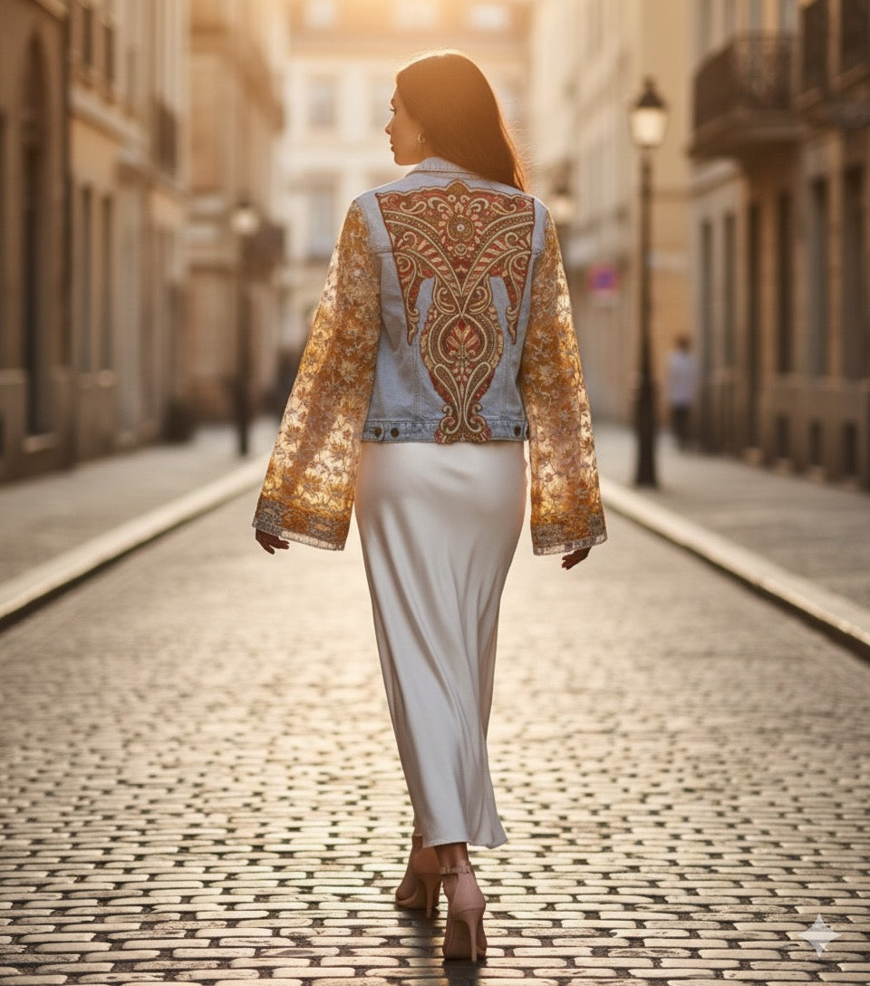 Espectacular chaqueta denim decorada con maravillosa joyería vintage india bordada a mano. Mangas de Sari de seda con joyería bordada. Chaqueta única y exclusiva.