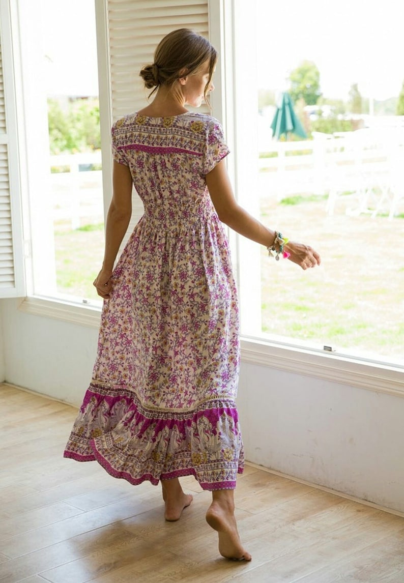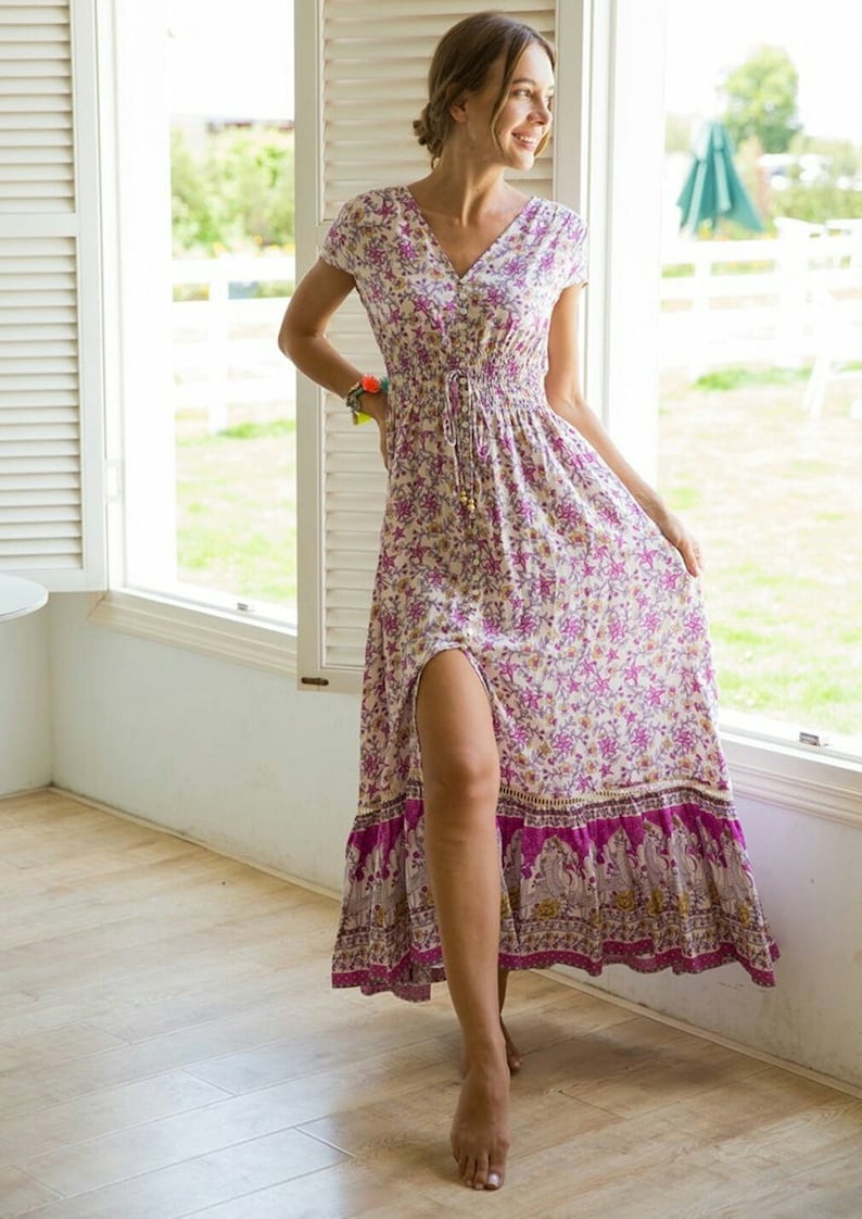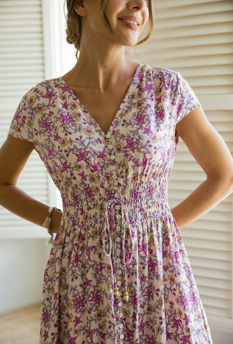 Vestido maxi de inspiración bohemia. Abotonado delantero, cintura elástica. Volante en el bajo. Borlas.