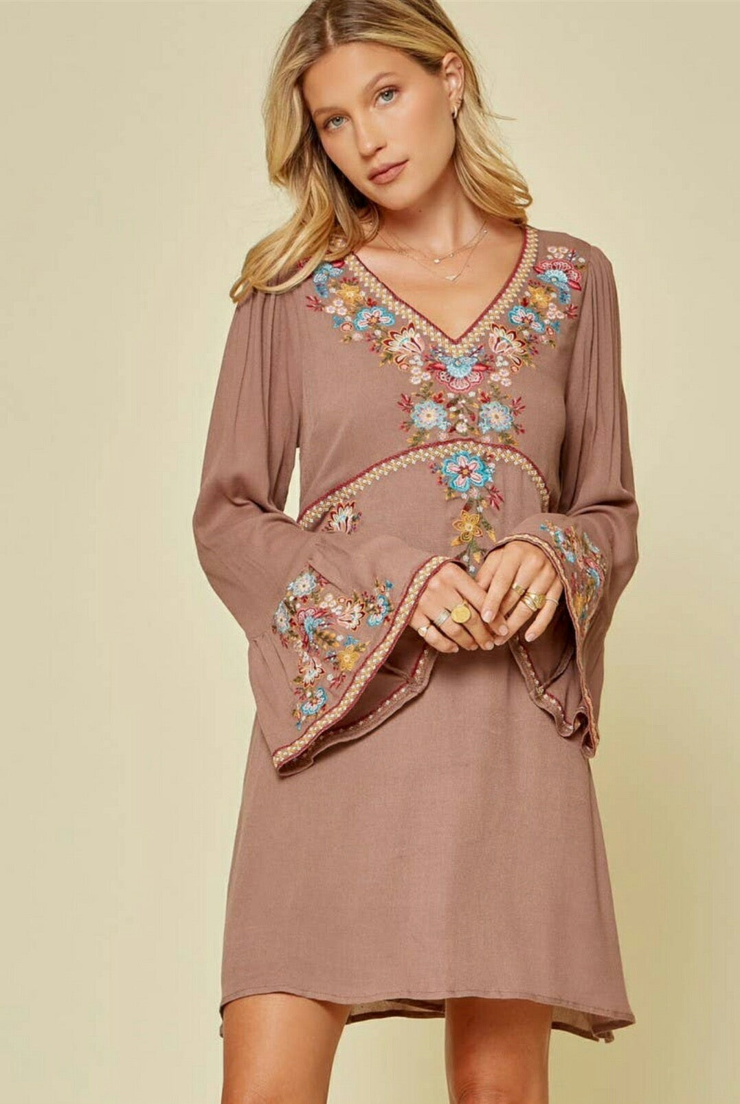 Vestido corto bordado en color café. Mangas acampanadas. Forro.