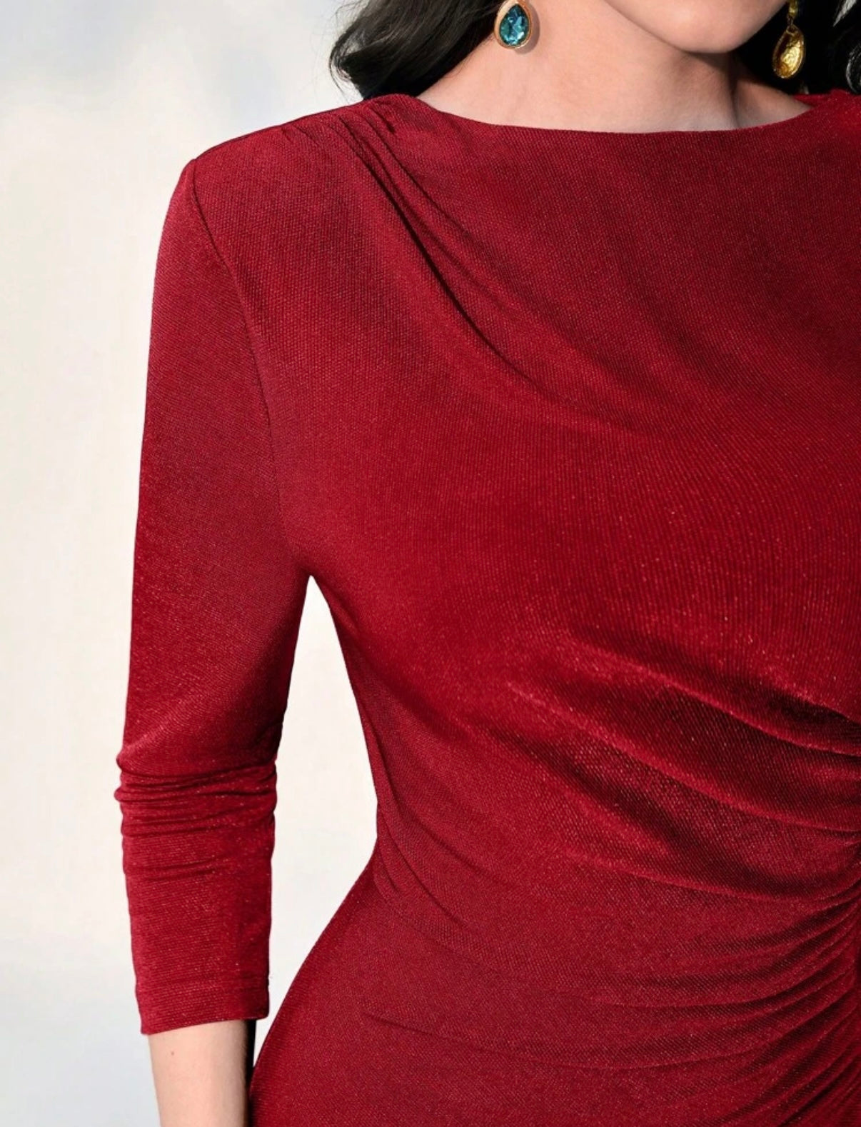 Vestido ajustado fruncido en color rojo. Manga larga. Hombreras.