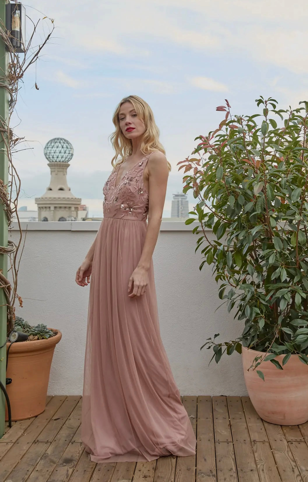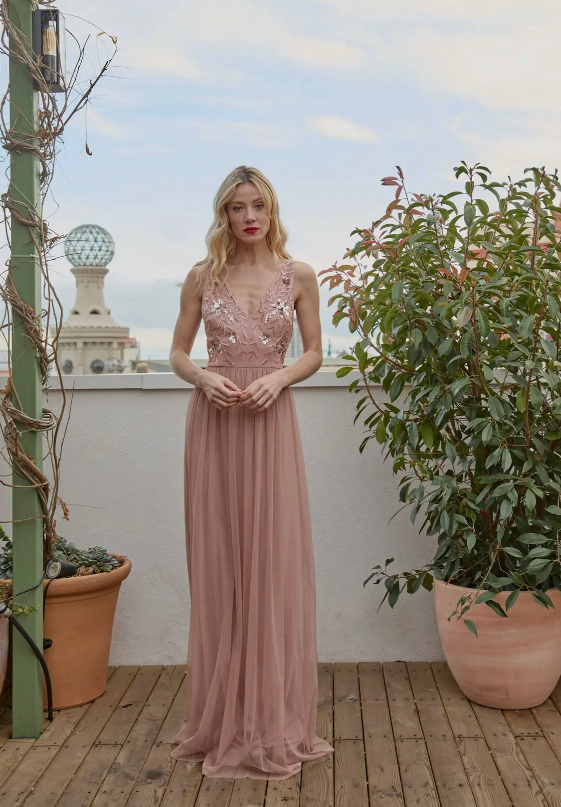 Vestido largo en color rosa pálido, realizado en tul y pedrería bordada a mano.