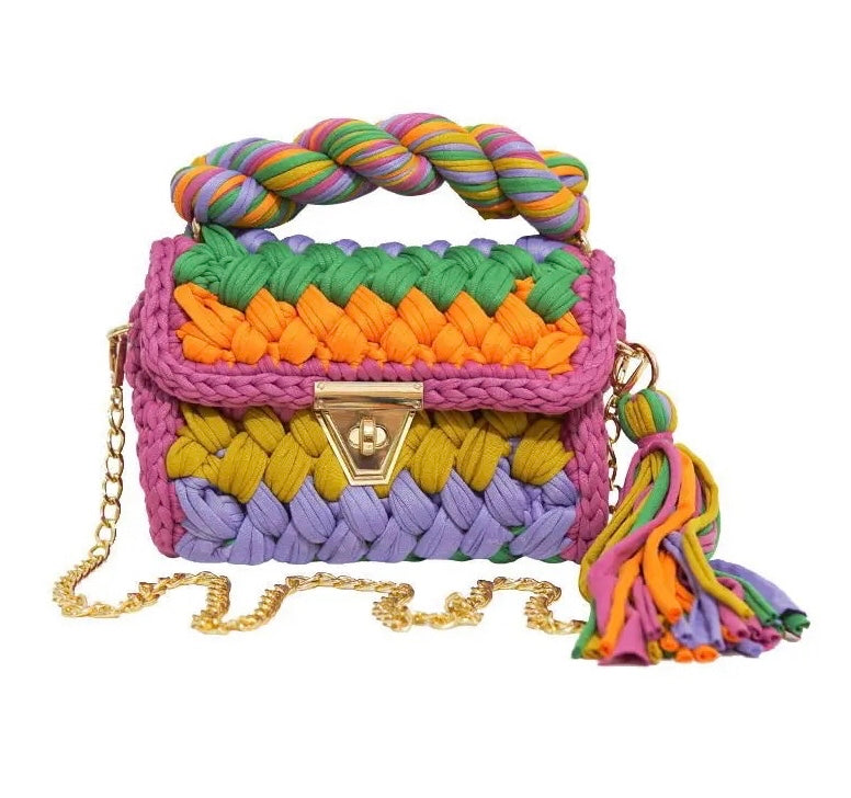 Bolso de inspiración bohemia, realizado en algodón reciclado. Multicolor. Asas. Cadena al hombro. Cierre metálico.