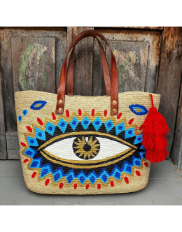 Capazo de estilo boho, realizado en palma natural totalmente artesanal, con diseño pintado a mano. Dibujo de ojo boho amuleto de la buena suerte. Asas hombros de cuero. Tamaño maxi.