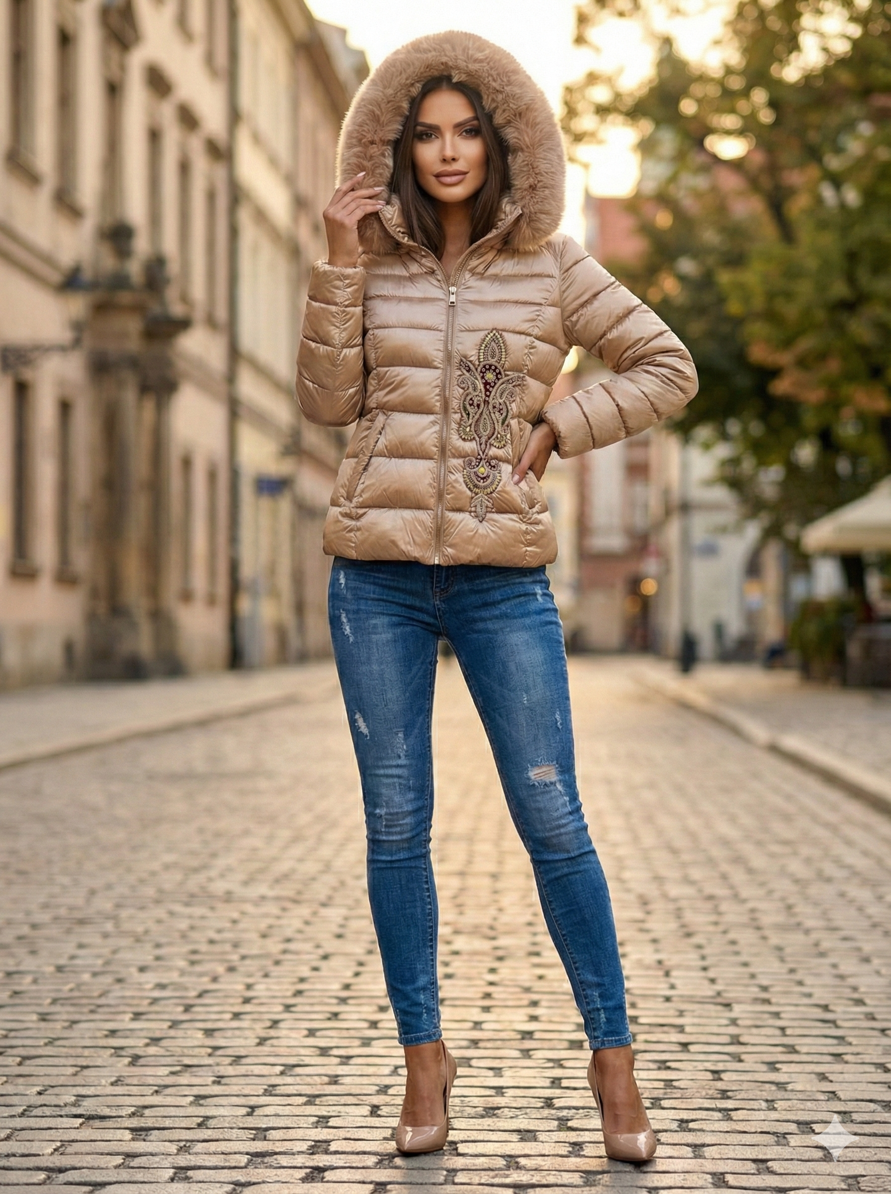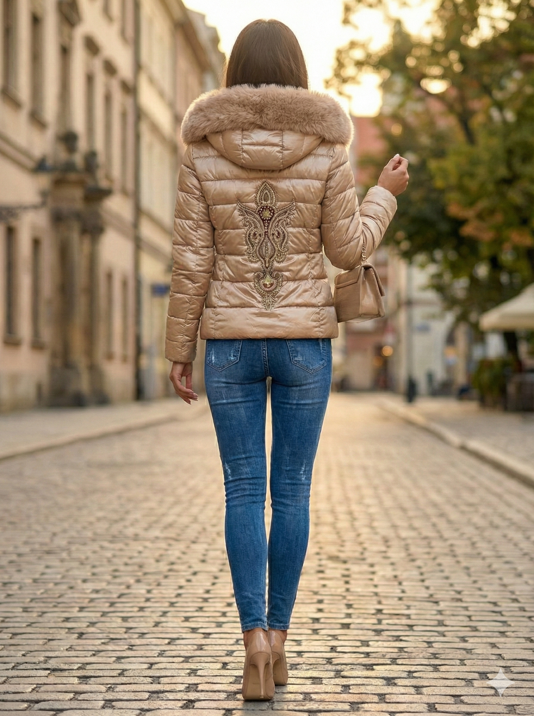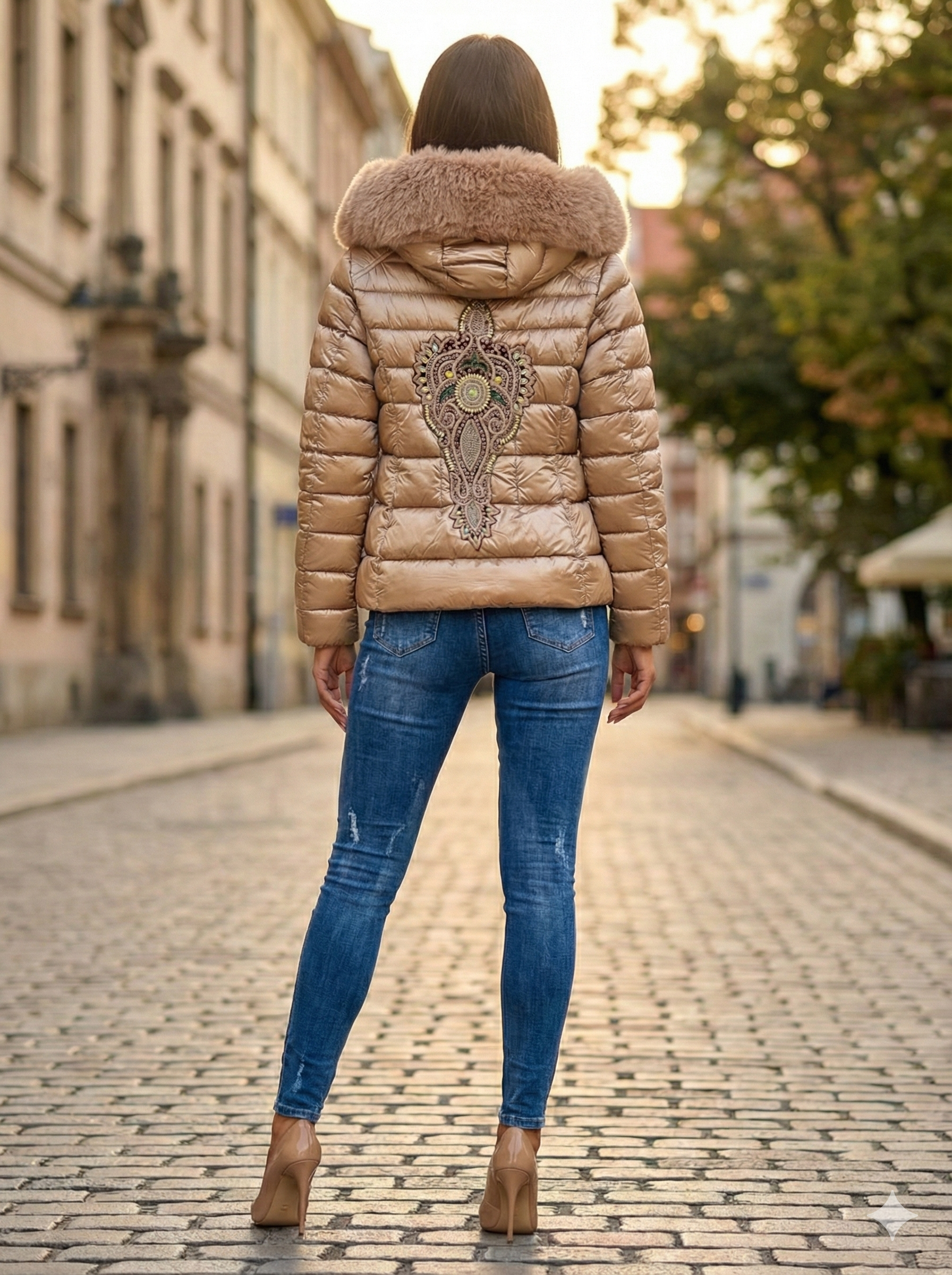 Deslumbra este invierno con nuestra exclusiva chaqueta acolchada en color dorado champán metalizado. Esta prenda combina calidez y máximo estilo gracias a su lujosa capucha con borde de pelo sintético y, sobre todo, a sus espectaculares aplicaciones de bordado joya estilo barroco en el pecho y una gran pieza central en la espalda. Una joya para tu armario de invierno.