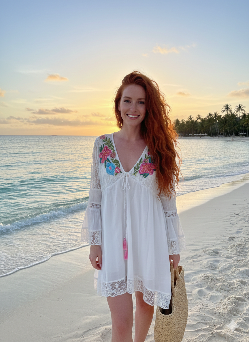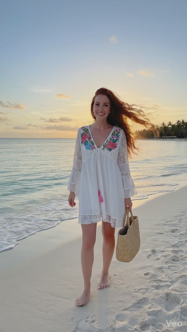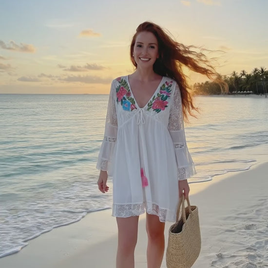 Siente la libertad del verano con nuestro vestido de inspiración bohemia. Confeccionado en un tejido ligero y fluido, este diseño destaca por sus delicados bordados florales en el escote y sus terminaciones en encaje artesanal. Sus mangas acampanadas y el detalle de los pompones rosas añaden un toque juguetón y femenino. Es la prenda perfecta para caminar descalza por la arena o para una tarde mágica frente al mar.