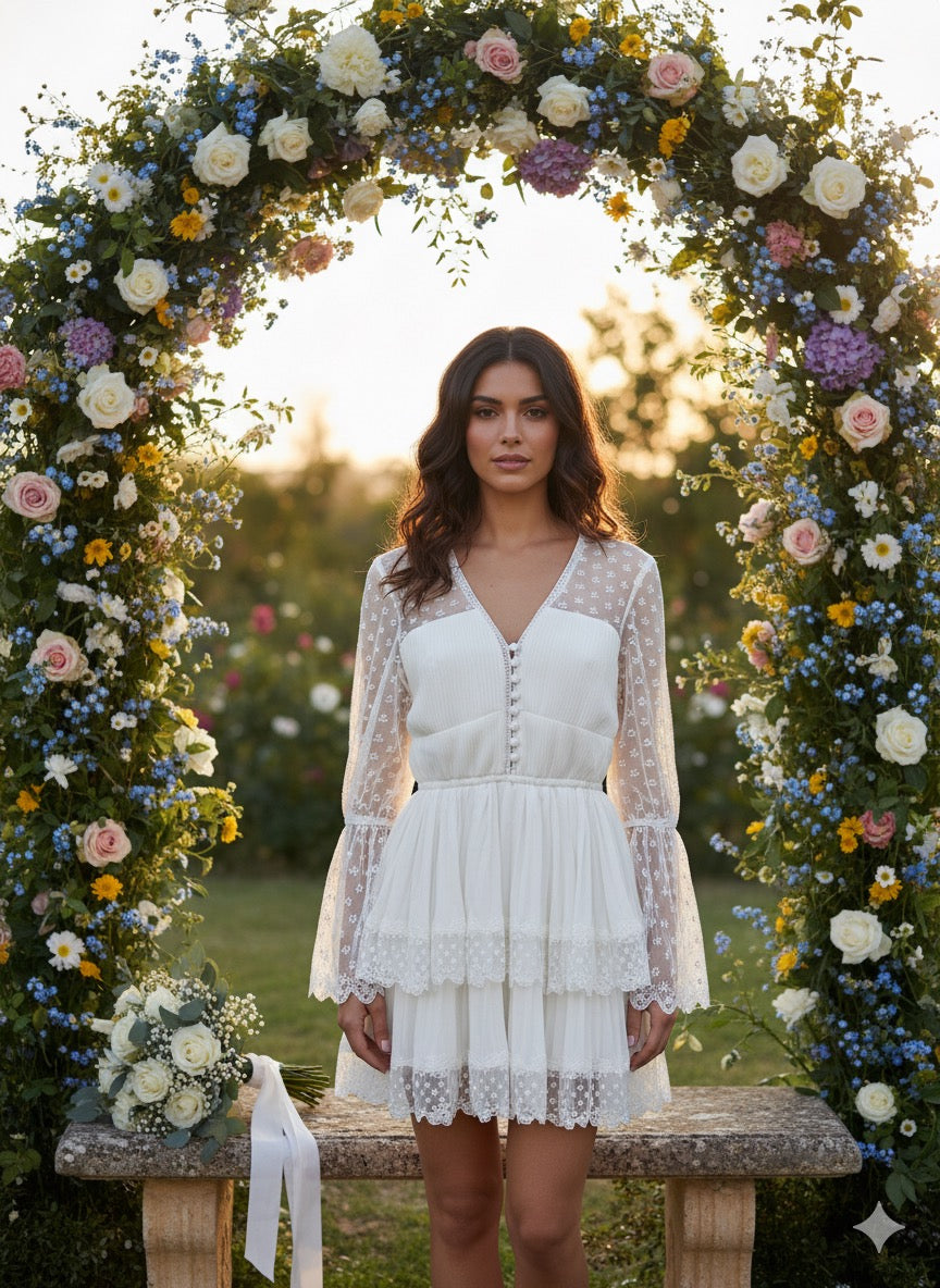 Vestido corto de novia, realizado en suave gasa y encaje. Cintura elástica. Botones delanteros. Forro.
