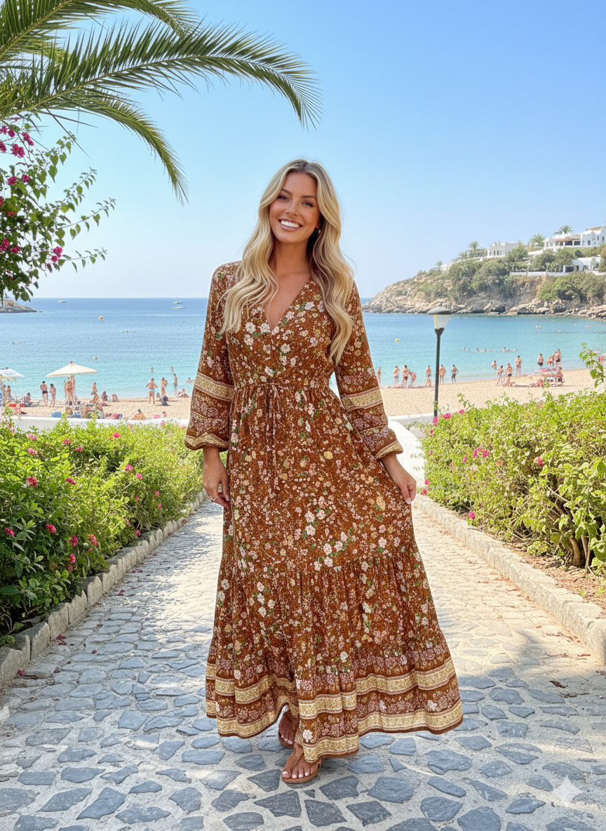 Si buscas el outfit perfecto para tus vacaciones, este vestido largo de estilo bohemio es la pieza definitiva. Diseñado con un cautivador estampado floral en tonos terracota y ocre, combina la elegancia relajada con detalles femeninos que realzan la silueta.
