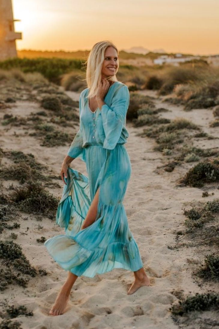 Vestido largo de inspiración bohemia con joyería bordada. Mangas acampanadas. Aberturas laterales. Cintura elástica. Botones delanteros.